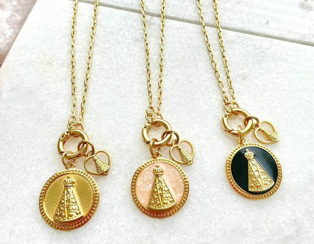 Colar longo com fecho bóia medalhão Nossa Senhora.