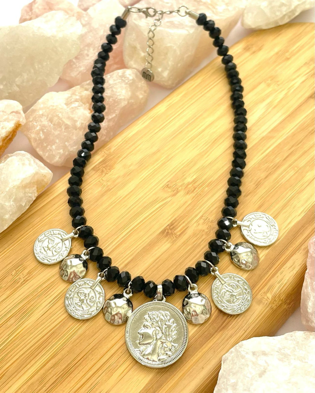 Colar em Cristal de Vidro Preto com Medalhas Niquel - Cód 1397- Adicione um toque de elegância ao seu visual com nosso colar deslumbrante! Este colar apresenta um sofisticado cristal de vidro preto, complementado por delicadas medalhas em niquel. Com regulagem, ele se adapta perfeitamente ao seu estilo.