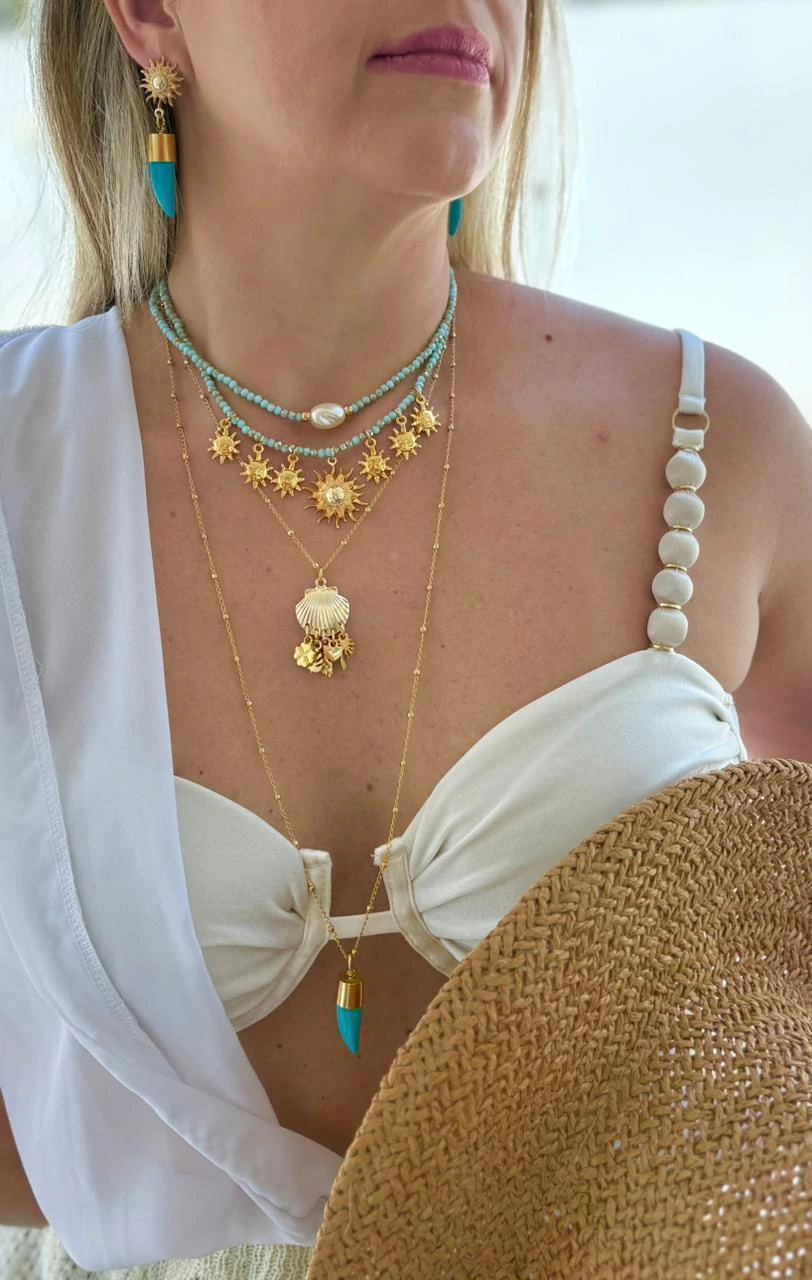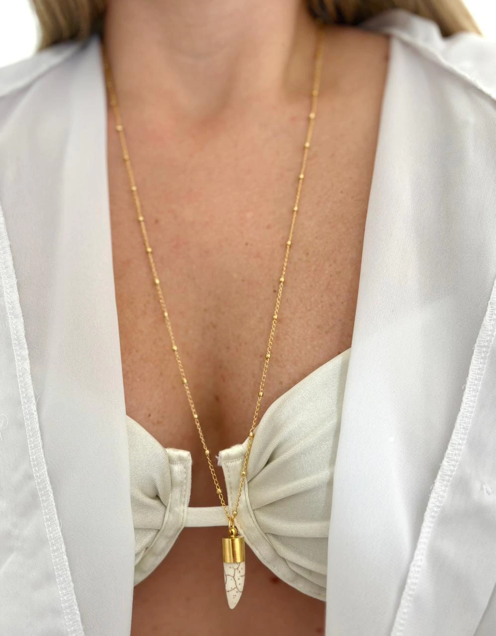 Este colar longuinho com pingente em dente feito em pedra hawlita é a escolha perfeita para quem busca um acessório sutil e cheio de personalidade. Com regulagem, adapta-se ao seu jeito, realçando seu visual com um toque natural e elegante.