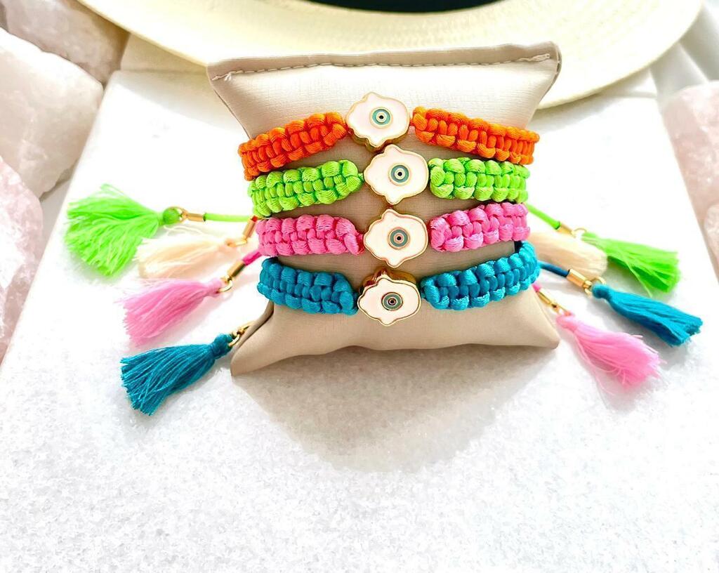Pulseira macrame com berloque mão de fátima, com regulagem.